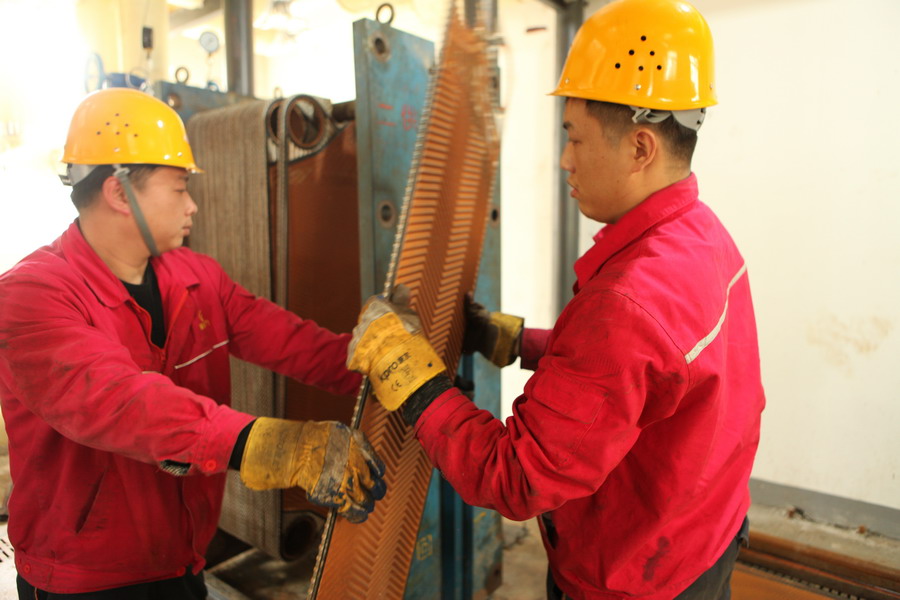 建厂局家属院换热站里,为解决换热效率不高这一问题,片区长王海斌与 4名检修人员正逐个拆卸、清洗站内的板式换热器。王海斌介绍,针对上一采暖季循环泵电机出现的噪音大、温度偏高问题,片区将对电机进行拆解、维修和保养。