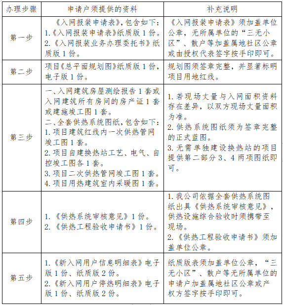 我公司向申请户提供《新入网用户信息明细表》及《新入网用户停热明细表》电子模板,由申请户按要求填报,我公司审核、查验无误后,完成申请户入网信息建档工作,至此报装业务办结。