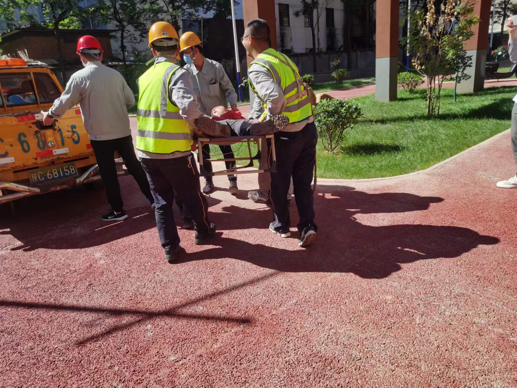 演练模拟焊工在热力井内长时间焊接作业,烟气造成呼吸困难,身体不适,随即向监护人员进行求助。监护人员初步判定为缺氧造成,立刻展开救援,向井下投放打开的氧气瓶,利用安全绳配合作业人员升井。随后逐级上报公司,并拨打 120、119救援电话,将遇险人员送至医院救治。