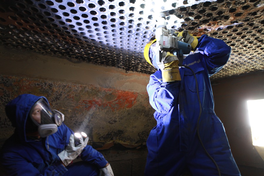另一处,检修人员正在疏通 2#锅炉空气预热器,空气预热器是利用锅炉排烟热量预热空气的换热器,是提高锅炉热交换性能、降低能量消耗的重要设备,空气预热器有预热管近万根,内部作业空间狭小、密闭,工作难度较大,目前,已完成整个工作量的30%。