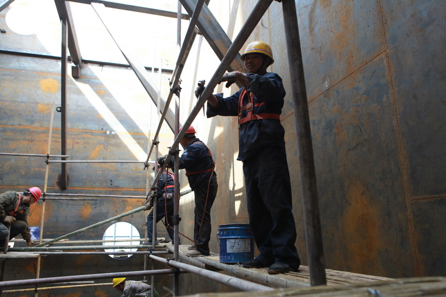 10 月 9 日上午,笔者在龙山热源站超低排放改造现场看到, 10 余米高的设备壳体矗立于煤场与厂房之间,大型起重机挥舞着长臂来回转动,运送着各种材料,数十名工人头戴安全帽,借助安全绳与脚手架在壳体边来回忙碌,或焊接,或对口,机械运转的轰鸣声与工人作业的对讲声不绝于耳,现场一片热火朝天的繁忙景象。
