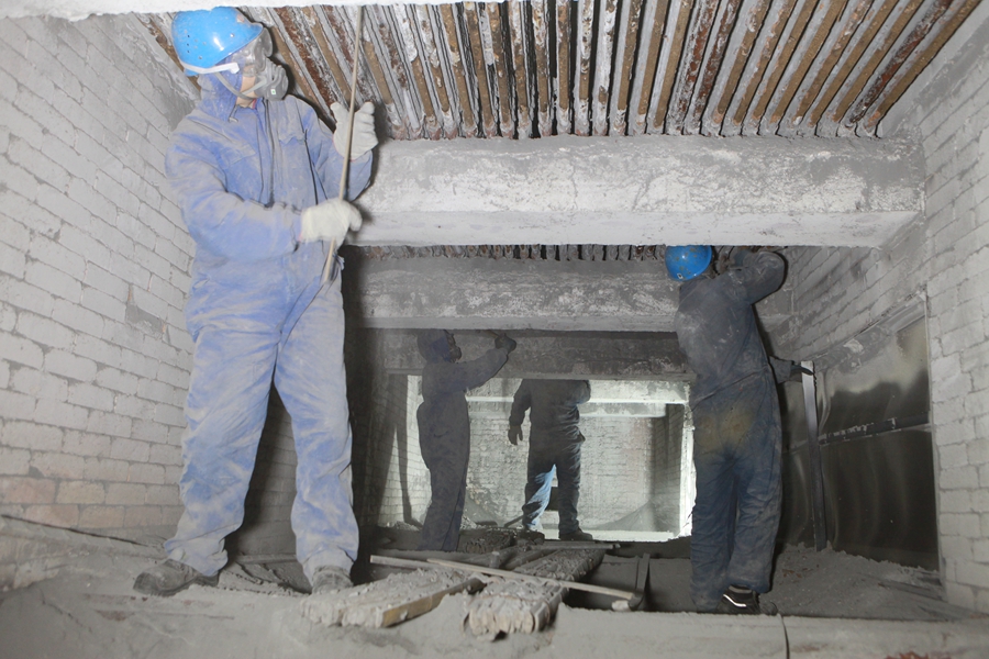 “不出去,钻进钻出的太麻烦也太吃力了,累了我们就在里面找个地方休息一下,渴了就把头伸出去让外边接应的同事递进水喝上几口”,当被问到怎么休息时,负责灰室清理的司炉工韩龙刚摘下厚重的口罩,笑着说。