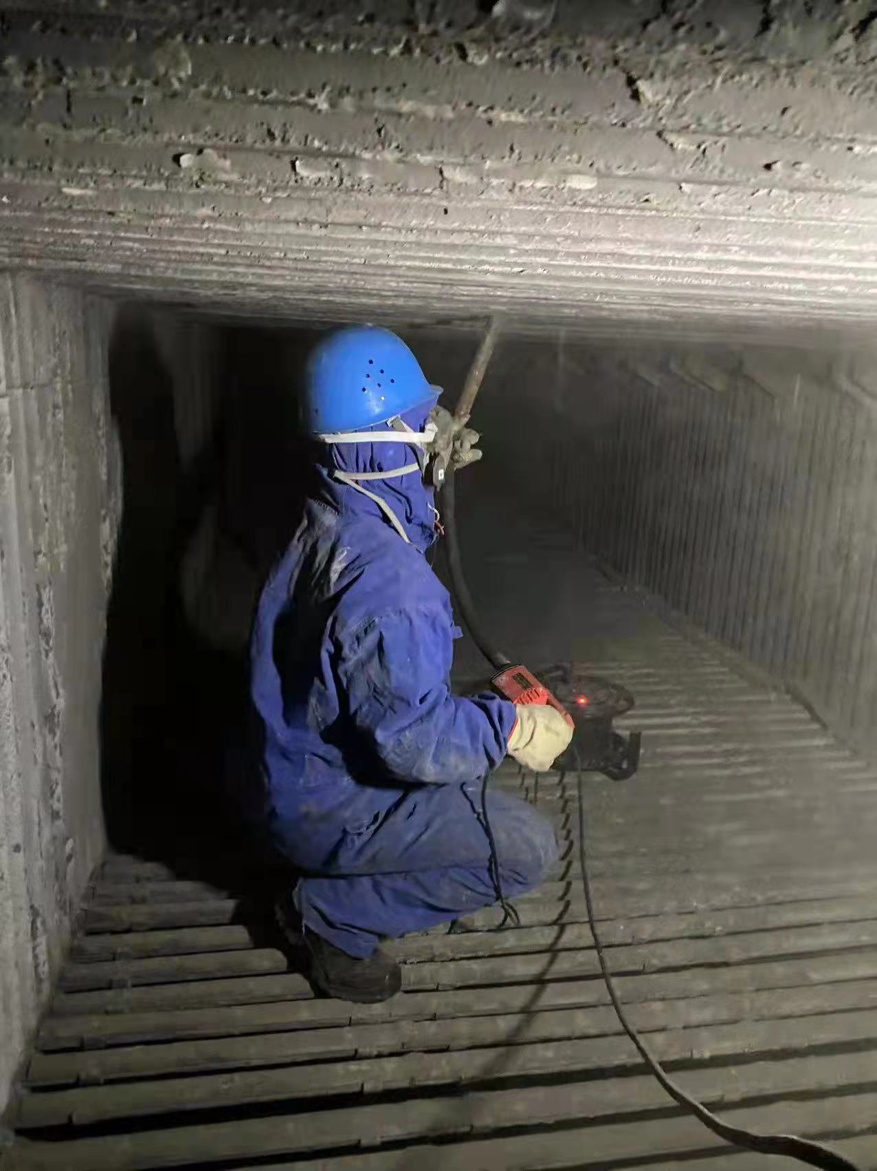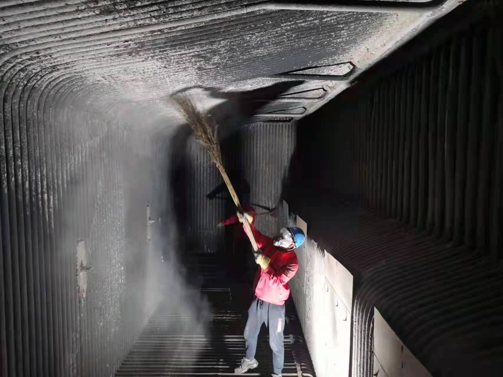 省煤器内,检修人员 “ 激战正酣 ” ,他们三人一组,分工协作,一个用振打器对蛇形管管壁的灰壳进行彻底清理,一个用扁铁将蛇形管间隙中振落的灰壳捅出来,另外一个用铁耙子不时的将两人脚下的杂物清理干净,防止绊倒,将安全检修做的恰到好处。几年的积累,使他们配合默契,不一会身后就堆一起了灰壳的小山 ……